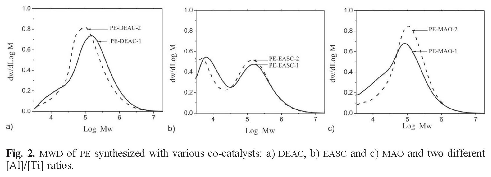 Data in Table 1 and Fig. 2 indicate that in the cases of DEAC and MAO the polydispersity (PDI) diminishes as the concentration of co-catalysts increases. The molecular weight distributions (MWD) of the synthesized PE in the presence of EASC showed two well-defined populations in both [Al]/[EASC] utilized ratios (see Fig. 2b). This behavior can be explained by the existence of more than one type of active sites performing the polymerization [26]. On the other hand, the asymmetry of the Gauss functions of MAO and DEAC, besides of their high PDI values, induces that, as well as EASC, these compounds leads to multimodality, i.e. present multiple active sites carrying out the polymerization. It has been previously reported that the multimodal gauss graphs obtained by using MAO (see Fig. 3) as activator are generated by the presence of residual TMA, which is the synthesis predecessor of MAO; however the reason of the multimodality of EASC and DEAC has not been reported.