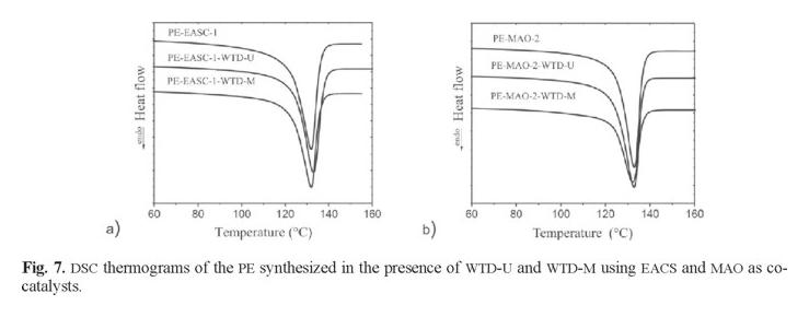 Fig. 7 shows the DSC analyses of the PE synthesized in presence of WTD, while the Table 2 shows the DSC results for all PE reported in Table 1. The obtained PE presented a Tm value between 130 and 134 °C, with or without WTD. EASC lead to obtain the highest proportion of crystalline phase, according to the Xc values, at low and high [Al]/[Ti] ratios. It was observed that the presence of WTD during the polymerization reduced the crystallinity of the resulting PE. To explain the observed behaviors it has to be considered that the PE melting process is mainly related to the short chain branching density, since by increasing short chain branching density the lamellar thickness of the crystal structure is decreased as well as the cristallinity degree [29]. In addition, the crystallinity can be reduced by incorporating fillers that hinder the crystalline alignment of polymer chains [30]. Given the above information, it is considered that EASC produces PE with a lower level of short chain branching. On the other hand, the presence of WTD during the ethylene polymerization would favor the formation of short chain branching and/or hinder the alignment of the polymer chains.