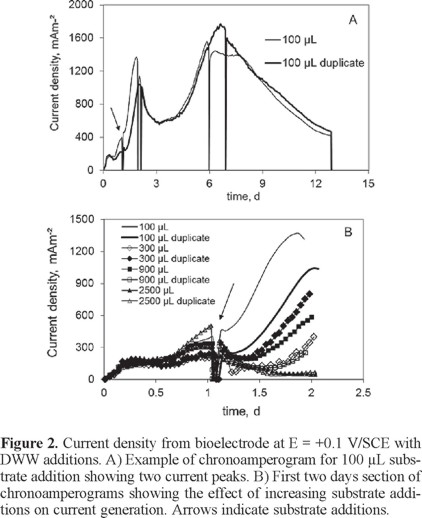 The current density during biofilm development (0-1 d) was stabilized in the range from 200 to 500 mA m−2. Thereafter, 100, 300, 900 or 2500 µL of DWW were added. The current density profiles were similar for all the DWW aliquots supplemented. The profiles showed a maximum and then decreased slowly without reaching the base line. Without another substrate addition, the current density increased again to reach a maximum that was higher than the first peak observed. Fig. 2A shows the chronoamperograms for 100 μL DWW addition as example.