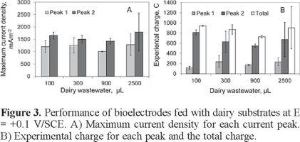 The carbon felt electrodes were pretreated by dairy waste impregnation in order to promote biofilm development on the nutritious layer [7]. The electrodes were immersed in a container with DWW, and sonicated for 10 min to enhance fibers and waste contact. The pretreated electrodes were placed in the electrochemical cells containing compost lixiviates and the biofilm was developed for 1 day at a +0.1V/SCE fixed potential. Once the bioanode was formed, 100, 300, 900 and 2500 µL of DWW were added in the cells. DWW had the following characteristics: pH 3.6-4.8, 4-6 mS cm−1 conductivity, and 136.5 ± 37.9 g L−1 chemical oxygen demand (COD). Current generation was determined in duplicate cells for each condition by 14 d.