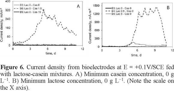 The current density without casein or lactose, i.e., the current due to the humic substances, decreased from 10 to 2 mA m−2 in 4 d. Therefore it was assumed that humic substances did not participate in the current measurements.