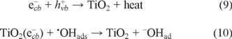 At the same time, the electrons that are photo-injected into the conduction band can react with dissolved O2 to produce H2O2, according to Equation 1, or they may be lost by recombination reactions with either unreached holes or with adsorbed •OH radicals, as indicated in Equations 9 and 10, respectively [28].