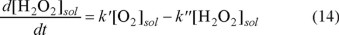 The activities of the compounds in the interfacial electrode solution in Equation 13 ([O2]0,c, [H2O2]0,c and [H2O2]0,a) can be associated with those in the bulk solution ([O2]sol and [H2O2]sol) by assuming a linear relationship between the two activity values through a mass transfer-related constant, which allows factorization and reduction of Equation 13 to Equation 14, in which two new constants, k' and k", contain information on the kinetic and mass transport properties of the system.