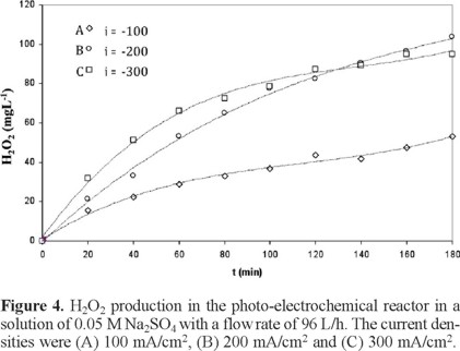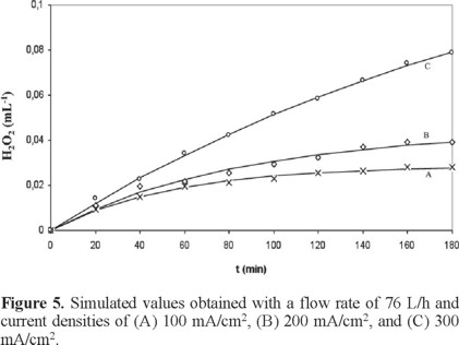 The results presented in Table 1 demonstrate that the greatest H2O2 production takes place when a current density of 300 mA/ cm2 and a flow rate of 76 L/h are applied. Under these conditions, k" is greater than k', and therefore the decomposition of H2O2 is inhibited.