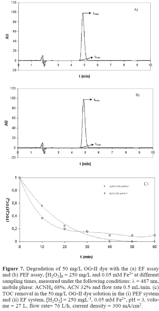Studies of OG-II oxidation by electrically generated H2O2 were carried out with a current density of 300 mA/cm2 and a flow rate of 76 L/h. In these experiments, two Fe2+ concentrations, 0.02 mM and 0.05 mM, in a total volume of 27 L were used. In both cases, the process started with an initial H2O2 concentration of 250 mg/L. Figure 6(A) shows the HPLC analysis of a solution containing 50 mg/L of OG-II treated with the EF system with a Fe2+ concentration of 0.02 mM, and Figure 6(B) shows the results for the PEF process under the same conditions. The results show that both the EF and PEF systems completely decolorize the OG-II system after 5 min of treatment, indicating that both are very effective for removing organic compound OG-II.