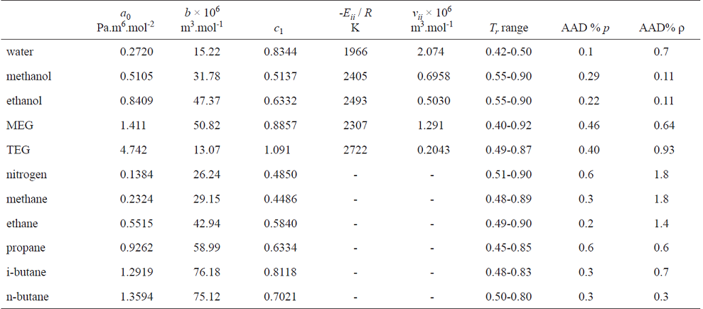 Determination of the five parameters (a 0 , b, c 1 , v ii , E ii ) for pure species (water, nitrogen, methane, ethane, propane, n-butane, i-butane, ethylene glycol and triethylene glycol) from their measured saturation pressures and liquid densities at saturation.