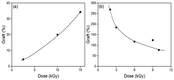 Fig. 2 shows the binary graft of the monomers onto net-CS as a function of dose. In the first case, the yield of grafting onto nCS3 increased with the dose and a maximum grafting percentage of 35 % was obtained at 15 kGy (Fig. 2(a)). In the case of nCS1, the binary graft of the monomers decreased with the dose, but higher grafting percentages were obtained (Fig. 2(b)). This behavior is due to an easier diffusion of monomers into nCS1 than nCS3, causing a higher swelling and a big grafting yield. By other side, it is well known that chitosan undergoes degradation with gamma radiation [12], but the nCS1 was degraded faster than nCS3.