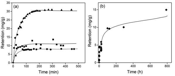 In spite to determinate the optimal time contact for Cr(VI) retention study, three grafted samples with different grafting percentages were chosen: BGnCS1 (184%), BGnCS1 (200%) and BGnCS1 (270%). The results can be observed in Fig. 3, it is clear that retention increased rapidly, and then leveled off at the maximum retention of equilibrium time. The retention onto nCS1 was about 17 mg of Cr(VI) g-1 of sample at 800 h. In case of binary grafting, the retention time was lower and depended of grafting percentage. Therefore, the Cr(VI) retention reached about 30 mg g-1 at only 3 h (180 min) in BGnCS1 (270 %), while BGnCS1 (184%) retained only 10 mg g-1. This decrease in the equilibrium retention time was due to the grafted chains were swelled too and they put more pressure into network, accelerating the swelling process.