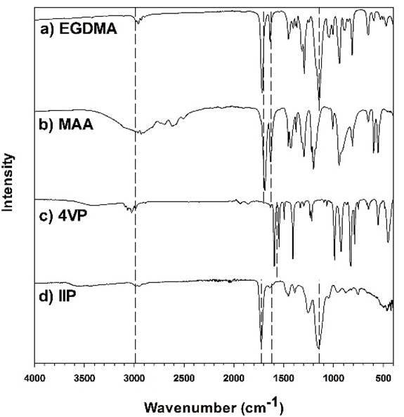 To identify the physical-chemical properties of the optimum IIP, the solid was characterized by different analytical techniques. The FTIR spectra (Fig. 2) shows a band at 2990 cm−1 and 2950 cm−1, attributed to symmetric and asymmetric stretching of -CH2 and -CH3 for all monomers. The bands at 1690 cm−1 and 1722 cm−1 are attributed to the C=O stretching of MAA and EGDMA, the bands around 1490 cm−1 and 1543 cm−1 are for the stretching vibration of the pyridine ring of 4VP, the band at 1146 cm−1 is for the stretching of C-O-C present in EGDMA, and at 3000 cm−1, there is a band attributed to the -O-H of MAA. The stretching band in the range from 1600 cm−1 to 1645 cm−1 is attributed to the C=C groups of all monomers, but these bands vanished in the IIP spectra as a result of the polymerization process [28,31].