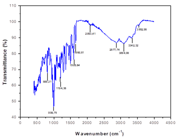 The FT-IR spectrum of the butanolic extract of Ephedra major is shown in Fig.1. The spectrum shows absorption peaks of 3552 and 3342 cm-1, which are assigned to the stretching vibrations of N-H. The wavenumbers around 1600-1200 cm-1 are due to stretching C=C, C=O, OH and C=N, while around 800-500 cm-1 they are attributed to the presence of C-C, C-O, =C-H and C-N. This shows that EBEM plant extract contains mixtures of compounds, i.e. amides, amines, aromatic and organic acids.