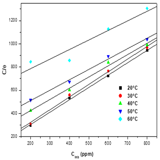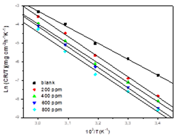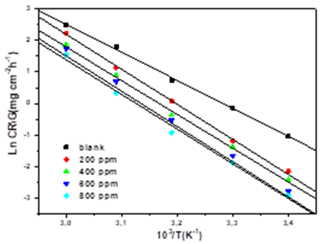 The further rise in temperature, decreased the inhibition efficiency showing a phenomenon of the quick desorption of adsorbed inhibitor molecules from the surface (Table 2), the protective layer formed on the surface of the steel by adsorption of the plant extract is destroyed and is no longer resistant. Generally, the effect of temperature on the inhibited acid-metal reaction is very complex, because many changes occur on the metal surface such as rapid etching and desorption of inhibitor and the inhibitor itself may undergo decomposition [27,28]. According to Ammar et al. [29], this phenomenon was explained by the high sensitivity of the Van Der Waals-type physical interactions between the iron surface and the inhibitor. Table 3 shows the obtained values of percentage inhibition (IEW), corrosion rate (CR) and surface coverage (θ) are summarized in Table 2 at different temperatures.