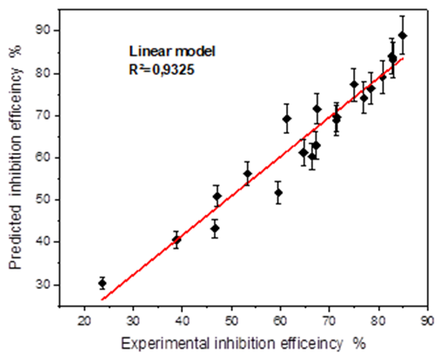 Mathematical modeling has proven to be an effective and useful tool to reduce the time and costs of experiments. Recently, some scientists have been providing research contributions to the development and application of new mathematical and statistical models to support the experimental work. As in Ref. [14], where the authors provided a mathematical linear model describing the inhibitory effectiveness of phenolic compounds derived fromEchium italicumL. Khadom et al. [15] developed a suitable linear statistical model to approximate the corrosion inhibitory efficiency ofCitrus Aurantiumleaf extract, at quantum level.
