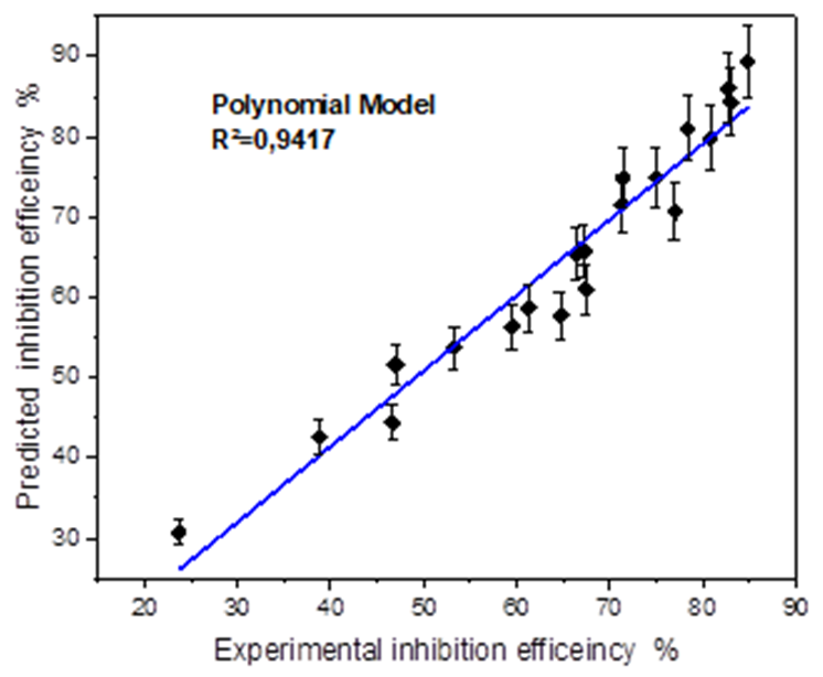 The second proposed polynomial model equation was obtained by representing the inhibition efficiency EIw (%) by the response function z which can be expressed by the equation bellow: