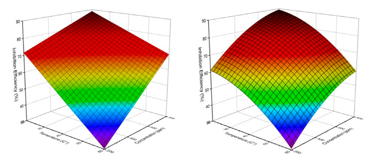 Mathematical analyses are in good agreement with experimental results confirming that inhibition efficiency is influenced by temperature, inhibitor concentration and their combined effect.