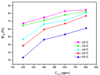 The inhibitory efficiency IEW (%) decreases while that of the corrosion rate (CRi) increases with temperature in the range 20 to 60 °C for all concentrations used. This behavior illustrates the physisorption of the inhibitor molecule.
