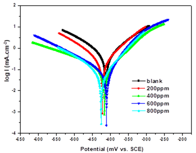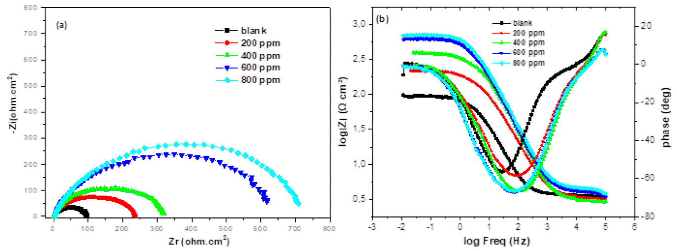 An increase of inhibitor concentration beyond 800 ppm resulted in a diminished corrosion protection. This may be due to the withdrawal of adsorbate (EBEM) back into the bulk solution when the concentration of inhibitor closed to or beyond the critical concentration [22,23]. The above effect leads to the weakening of metal-inhibitor interactions, resulting in the replacement of inhibitor by water or chloride ions (Cl−) with a decrease in inhibition efficiency [23,24].