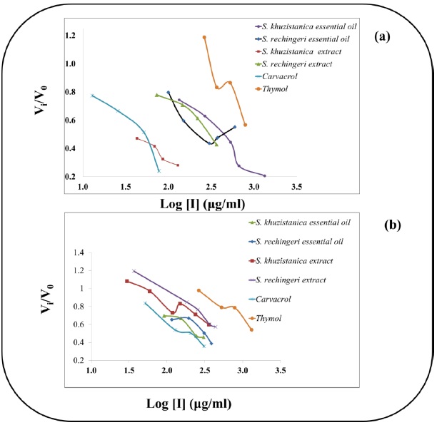 Fig. 2 The plot of VI/V0 against log[I] for essential oil of S. khuzistanica and S. rechingeri, Carvacrol, and Thymol. VI and V0 are AChE (a) and BChE (b) activities (OD min-1), and [I] is the inhibitor concentration (μg/ml).