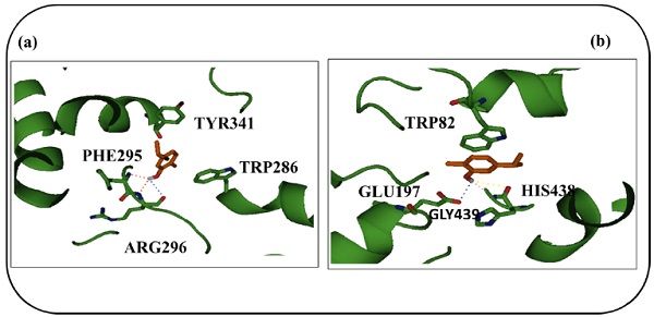 Fig. 3 Docking of Carvacrol in AChE (PDB ID: 4EY6) (Chain A (a)) and BChE (PDB ID: 4BDS) (b). AChE and BChE are represented in green and Carvacrol in orange, (hydrogen bonds between O-H…N (Arg296), O- H…N (Phe295), and C-H…π interaction (Tyr341) (a); O-H…O (Glu197), O-H…N (Gly439), O-H…O (His438), and π-π stacking interaction (Trp82) (b).