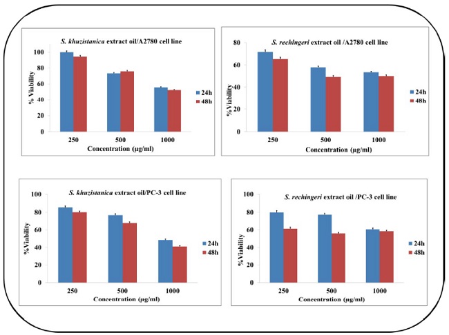 Fig. 4 Cytotoxic effects of essential oil of S. khuzistanica and S. rechingeri in different concentrations and times against A2780 and PC-3 cell lines (a - d). The data were expressed as the mean ± SD from 3 independent experiments (P<0.05).