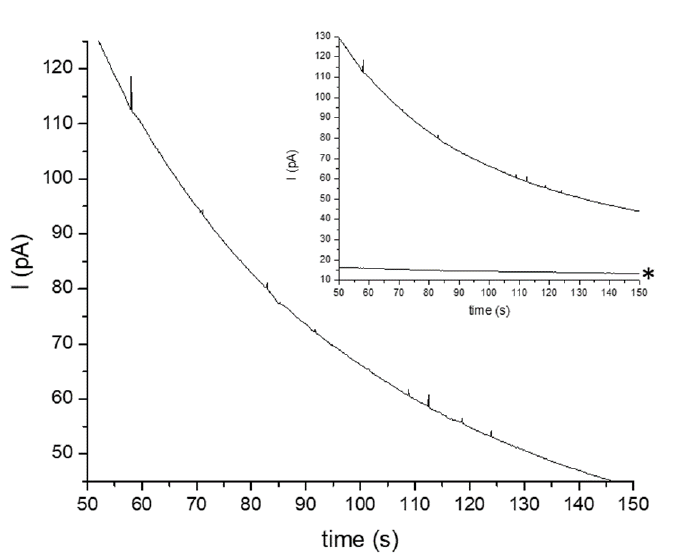 Fig. 4 Amperometric i vs t curve of a 5.0 fM CuZnSOD solution in phosphate buffer, pH = 7.8, at an applied potential (E) of 0.200 V vs. Ag/AgCl (3 M AgCl). Inset showing i vs t curves of: 5.0 fM CuZnSOD solution (upper) and a blank of phosphate buffer solution, pH = 7.8 (bottom *).