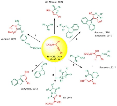 The reactivity of imines and carbene complexes has been reported by various authors. Imines were reacted with simple Fischer-type carbenes by Hegedus via thermal and photochemical routes, leading to new carbenic complexes and lactam nuclei, respectively [23]. On the other hand, de Meijere found that chromium alkynyl carbene complexes react with imines to produce the Michael adduct, which undergoes cyclization in thermal conditions to generate 2H-pyrroles (Scheme 1(a)) [24]. Meanwhile, Aumman [15] obtained Michael adducts and mesoionic pyrrolium carbonyltungstates by the reaction of imines with alkynyl chromium(0) carbene complexes (Scheme 1(b)). Subsequently, Sampedro´s group [16,25] conducted a complete computational mechanistic study of the same reaction to afford potential molecular switches and motors. In a later publication, this group documented the reaction of oxime derivatives and alkynyl Fischer carbene complexes to furnish four distinct types of nitrogenated heterocycles [26,27] (Scheme 1(c) and (e)). Yu achieved [28] the regioselective [3+2] annulation of azomethine imines with 1-alkynyl Fischer carbene complexes to synthesize versatile functionalized N,N-bicyclic pyrazolidin-3-ones (Scheme 1(d)). Along the same lines, our group has described the reaction of alkynyl Fischer carbene complexes with α-imino glycine methyl esters to provide 1,2,3,5-tetrasubstituted pyrroles (Scheme 1(f)) [11].