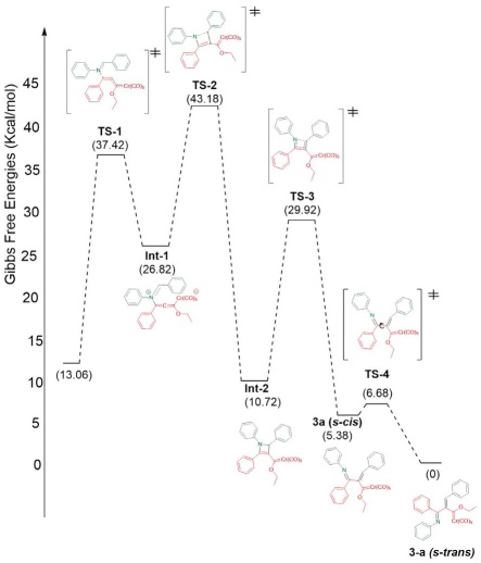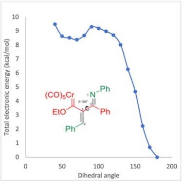 Considering the experimental findings, a computational study was performed to account for the mechanism of formation of the new compounds 3a-n. The potential energy surface was calculated for the proposed four-step mechanism (Scheme 4), involving three intermediates and three transition states (Scheme 5). The first step consists of the 1,4-addition of the nitrogen atom of the imine to the alkynyl Fischer carbene, leading to transition state TS-1 with an N-Cβ bond distance of 1.95 Å and an activation energy ((G≠) of 37.42 kcal/mol. Afterwards, intermediate 1 (Int-1) is generated, with a reactant energy ((Gº) of 13.76 kcal/mol. Int-1 undergoes an intramolecular attack by the carbenic anion and is converted into the iminium moiety by passing through the cyclic TS-2, which is the rate-determining step ((G≠ = 43.18 kcal/mol). The distance of the C-Cβ bond formed is 2.24 Å for Int-1 but only 1.40 Å for intermediate 2 (Int-2). The latter exhibits much greater stability than Int-1 ((Gº = 16.10 kcal/mol). Subsequently, the thermally allowed electrocyclic opening of the aza-cyclobutene of Int-2 brings about transition state 3 (TS-3) with an activation barrier ((G≠) of 29.92 kcal/mol, which in turn evolves into 3a (s-cis) with a dihedral angle of 68.83° (Figures 3 and 4). Interestingly, greater stability (-5.38 kcal/mol) was found for the s-trans than the s-cis conformation of 3a. To find the transition state barrier associated with the rotation, a SCAN of the dihedral rotation was performed (Scheme 6), using 18 steps spanning an interval of 0-180 degrees (consisting of 10 degrees for each step), starting from the s-cis and arriving to the s-trans conformation. The energetic profile shows two minima: the 3a s-cis structure at 68.83º and the more stable 3a s-trans conformer with an activation energy ((G≠) of 1.30 kcal/mol between both rotamers. The stability of the s-trans conformer is in agreement with the experimental results for compound 3a.