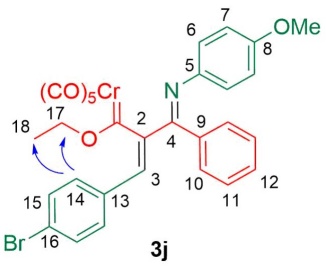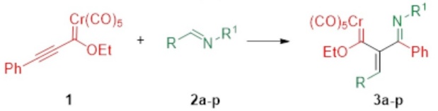 Under the optimized conditions, the scope of the methodology was explored by modifying the aromatic substituents of the benzylidene aniline (2a-p) while keeping 1 as the phenyl alkyne carbene complex (Table 2). The new complexes 3a-n were achieved in 45-70 % yields. Prolonging the irradiation time led to the decomposition of the carbene complex and only traces of the target compound.