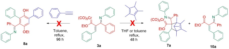 It is reported that metallatrienes are precursors of cyclopentadienes [58], indenes [59], naphthalenes [60], homopyrroles [61], and other carbo- and heterocycles [22]. Hence, some experiments were conducted to evaluate the reactivity of the new metallatrienes 3a-n. The reaction of 3a and pentamethylcyclopentadiene was attempted under the [4+2] cycloaddition conditions previously described. The reaction did not proceed in THF or toluene at reflux for 48 h, and a consequence, the starting materials were recovered. The results of the Dötz reaction of phenylacetylene with 3a in toluene was also examined after refluxing for 96 h. The 1H NMR analysis of the crude reaction mixture did not show the expected transformation, but the oxidation product 10a was detected (Scheme 2).