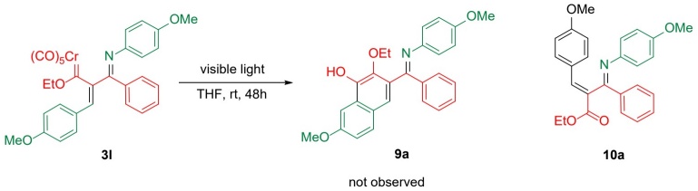 With the objective of forming a six-membered cycle in complex 3l, further experiments were performed with UV and visible light irradiation to attain the insertion of CO and the subsequent cyclization to phenol 9a. Nevertheless, the desired product was not found and only the oxidized compound 10b was isolated, afforded in a moderate yield of 59 % (Scheme 3). Despite there being an α,β-unsaturated system in complexes 3a-n, indicating susceptibility to Dötz benzannelation, such a reaction did not take place for 3l, probably because of the steric effect of the bulky substituents.