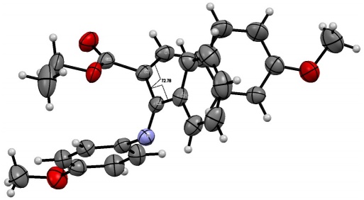 A crystal sample was obtained by the slow diffusion of n-hexane in a CHCl3 solution with 10b at 4 ºC. The crystallized compound fits in the monocyclic crystal system. The space group P21/c and unit cell parameters are a = 17.0269(12) Å, b = 9.6109(5) Å, and c = 14.1952(8) Å, as well as ( = 90°, ( = 104.895(7)°, ( = 90°, and a volume of 2244.9(2) Å3. According to the crystalline structure of 10b, oxidation of 3l and removal of the steric hindrance of the bulky Cr(CO)5 group leads to isomerization of the double bond of this compound to the E configuration [torsion angle: C1-C2-C6-C21 = 72.78°]. Moreover, the ester group adopts the s-cis conformation and the imino moiety is orthogonal to the double bond (Fig. 2).