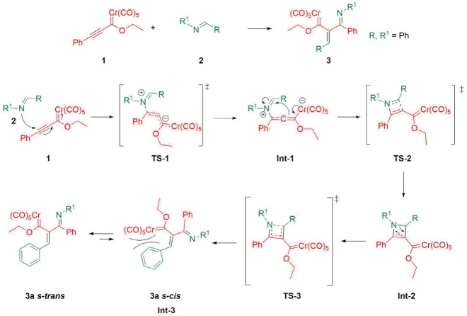 Microwave irradiation promoted the reaction between the Fischer carbene complex of Cr(0) (1) and benzylidene anilines 2a-n, obtaining moderate yields of new, stable, and polysubstituted Fischer carbenes with a cross-conjugated system. In all cases, complexes 3a-n were afforded as single Z (double bond)/E (imino group) isomers, while the oxidation product 10a changed to the E (double bond)/E (imino group) configuration. The computational study of the reaction mechanism revealed that the formation of the dihydroazete intermediate (Int-2) is the rate-determining step of the reaction. The proposed mechanism involves a 1,4-addition/ring closure/electrocyclic opening cascade reaction. The reaction did not proceed in any of the compounds 2 that had an electron withdrawing group in the aromatic ring of the imine moiety. Even though complexes 3a-n did not evolve into the Diels-Alder or the Dötz products (probably because of the great steric effects exhibited by the organometallic compounds), these kinds of structures are interesting from a synthetic and theoretical point of view. Further research on Fischer carbene complexes of W(0) and Mo(0) with different substituents is currently under way, and the results will be reported in due course.