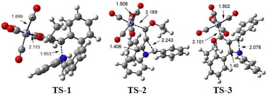 Fig. 3 Structures corresponding to the transition states TS-1, TS-2, and TS-3 at the M06-L/6-311++G**/Cr=LANL2TZ/SCRF=THF level of theory. Bond distances are given in Å. Color code of the spheres pictured: hydrogen atoms in white, carbon atoms in grey, nitrogen atoms in blue, oxygen atoms in red, and chromium atoms in light blue.