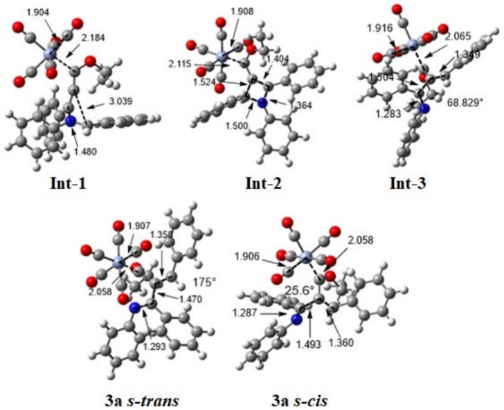 Fig. 4 Optimized structures of intermediates Int-1, Int-2, and Int-3, as well as products 3a (s-cis) and 3a (s-trans) at the M06-L/6-311++G**/Cr=LANL2TZ/SCRF=THF level of theory. Bond distances are given in Å. Color code of the spheres depicted: hydrogen atoms in white, carbon atoms in grey, nitrogen atoms in blue, oxygen atoms in red, and chromium atoms in light blue.