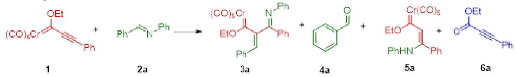 Transition metal Fischer carbene complexes undergo cycloaddition reactions with a variety of substrates, and the growing body of research on their use is creating a broad new field in chemistry [1-8]. Even the simplest carbene complexes have exhibited great versatility[9]. The scope of the reaction increases in the event of the formation of an unsaturated system and is controlled by the type of substituents[10-14]. As a result, these organometallic complexes are capable of reacting with imines and many other molecules. Imines are important building blocks because they can contain not only nucleophilic or electrophilic sites but also a combination of the two, thus allowing for different reaction pathways in some cases [15-17]. Usually, this reactivity favours the synthesis of cyclic compounds in a few steps[15,16,18-23].