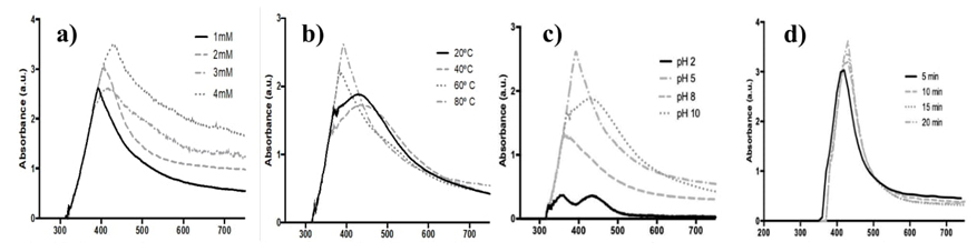 The effect of time reaction was evaluated using AgNO3 1mM, pH 5 and 80 ºC. Fig. 1(d) shows the spectra of AgNPs at different reaction times, after ten minutes of reaction no SPR wavelength displacements were observed. The increment of the SPR absorption band indicates an enhancement in the formation of AgNPs. The reaction was completed at 30 min and a precipitate was obtained.