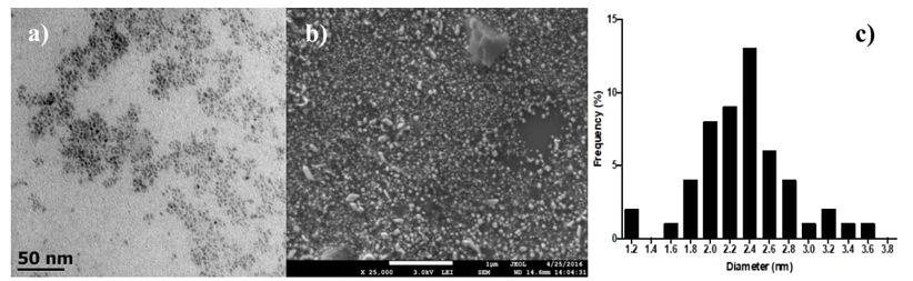 The synthesis of AgNPs was conducted in the optimal conditions established in the previous experiment (AgNO3 1mM, pH 5, 80 ºC and 10 min). Fig. 2 shows the morphology of nanoparticles obtained by SEM and TEM, the AgNPs were spherical with diameters between 1-4 nm. Several plant extracts have been used to synthesize spherical AgNPs with sizes ranging from 0.5 nm to 100 nm [8-10]. The oregano AgNPs obtained here are smaller than those obtained from European oregano (Origanum vulgare) aqueous extract (136 nm) [18], and ethanolic extract (30-58 nm) [19]. Similar size was reported for AgNPs obtained from Polygonatum graminifolium (3-15 nm) [38], Coriandum sativum (6.95 nm) [39], Sida cardifolia (3-8 nm) [40], Piper retrofractum (1-5 nm) [41], and Allium sativum (3-6 nm) [42].