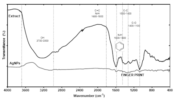 Fig. 3 shows the DRIFT spectra for the dried extract, where the typical fingerprint region from 800 to 1800 cm-1 attributed to the stretching and bending vibrations characteristic of the L. graveolens secondary metabolites is observed [43]. This region included the signals at 1100-1400 cm-1 corresponding to C-O of hydroxyl groups, bands at 1400-1500 cm-1 corresponding to C-O and C-C stretching vibrations specific to phenyl groups, signals at 1500-1600 cm-1 corresponding to aromatic domain and N-H bending, and the region at 1600-1800 cm-1 corresponding to bending N-H, C=O stretching’s signals assigned to aldehydes, ketones, and esters [43,44]. Other important band observed was at 3000-3700 cm-1 corresponding to O-H stretching vibrations. The spectra of the dried AgNPs displayed most of the DRIFT bands of the extract, which confirm that the secondary metabolites play the role of capping and stabilizing agents in the synthesis of AgNPs. Some displacements were observed for some bands that represent the interactions of functional groups with AgNPs surface [45].