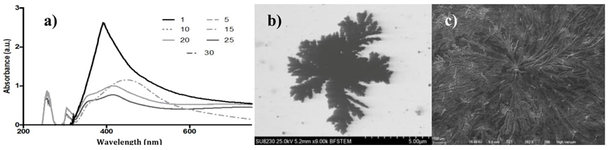 Fig. 4(a) shows the UV-Vis spectra of AgNPs at different times of storage. After fifteen days of storage at room temperature, the AgNPs SPR signal changed drastically, and after a month under storage, the colour of the AgNPs solution turned dark- gray and a sediment was formed. As storage time increase, the SPR signal gets wider and shifted to higher wave numbers, confirming changes of shape and size of the nanoparticles. After one month of storage, the SEM and TEM images (Fig. 4(b)-(c)) evidenced AgNPs clustering with a morphology which has been denominated flower-like [46]. It has been proposed that the formation of the dendritic structures involves the aggregation of NPs to form micrometric worm-like structures that serve as template for the growth of multi-branched structures [47]. These dendritic structures can be used in catalysis, and antimicrobial metallic coatings, among other applications [48,49].