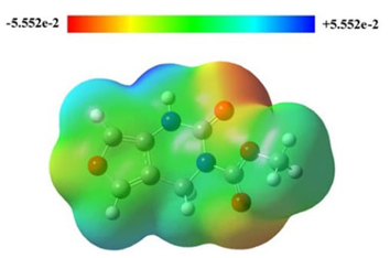 As MEP allows us to have insight into the chemical reactivity of a molecule, the highest negative charge -0.059 region by red shade in Fig.3 is the electrophilic region. The negative electrostatic potential indicates the concentrated electron density in the molecule interacting with the receptors and forming hydrogen bonds with the positive sites of amino acids. They correspond to the tops of two carbonyls. The highest positive charge +0.059 region by blue shade is the nucleophilic region which corresponds to the hydrogen in the N-H bond. The green area can be considered almost a neutral region.