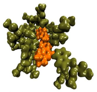 Fig. 1 Electron density in the Risperidone (orange) - DRD2 (green) system, which contains 571 atoms.