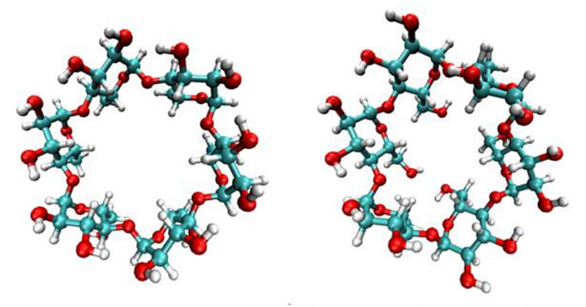 More recently, molecular dynamics calculations show that α, β, and γ-CD cause significant CDs deformations when complexing molecules such as sertraline and abacavir. Ab initio DFT calculations showed that X-ray structures are maxima at the potential energy surface (PES), and that not only hydrogen bonds are responsible for the stabilization of the inclusion complex, but other interactions such as H•••H and Lewis acid base type interactions [31,32]. Deformation of cyclodextrins is an important element to be considered in inclusion compounds. The deformation can be obtained from docking and dynamic molecular techniques, and it is crucial to do this before applying DFT methods to characterize non-covalent interactions. Distortions found in α-CD are presented in Figure 2. Structure on the left side corresponds to that obtained from X-ray experiments. The structure on the right side corresponds to the average structure obtained from classical molecular dynamics. From this figure it is evident the distortion observed when the α-CD is submitted to movements induced by classical molecular dynamics. The adequate description of the PES of different conformations due to conventional and non-conventional hydrogen bonds, depends on the correct description not only of intermolecular interactions, but also intramolecular, as it was demonstrated for the alanine dipeptide [33].
