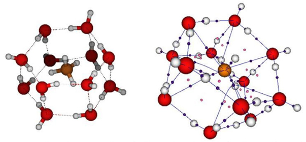 Hydrogen bonds and other interactions are also important factors in the structural conformations of different molecules and the physicochemical properties that they can display. For example, hydrogen bonds are crucial for the decomposition of three common neonicotinoids used as insecticides [36] or the formation of clusters of NaCl(H2O)2[37]. The solvation of Cu2+ ion is also important. In this case, we used a modified version of the simulated annealing method to explore the potential energy surface of [Cu(H2O)n]2+ with n=12, 16 and 18 in order to find the coordination number of Cu2+ ion. By using QTAIM we found that the fivefold coordination is preferred and the fourfold coordination cannot be considered in studies where the Cu2+ion is solvated by water molecules [38].