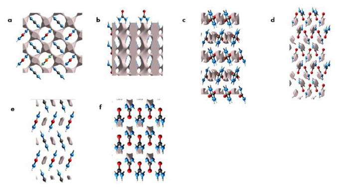 The packing in a crystal is an important point to be considered for intermolecular interactions since the pressure exerted over a system is mapped on the contacts between molecules. For urea, our group described in detail how the hydrogen bond is altered as a function of the pressure. It is worth noting that the structures used in this study were obtained from experimental data, in particular, X-ray structures [47]. The changes of hydrogen bonds have an impact on the electron density voids observed in the crystal structure as it is shown in Figure 5.