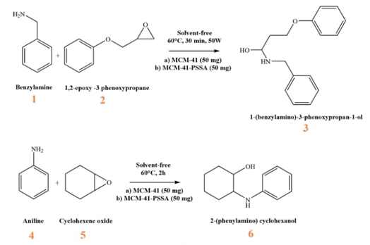 The nucleophilic opening reaction of two epoxides with two amines under classical and microwave-assisted heating conditions was used to test and compare the acidity of PSSA-functionalized materials. Aldrich brand reagent was used without prior purification. 1.1 mmol of benzylamine or aniline 1 mmol and 1,2-Epoxy-3-phenoxypropane or cyclohexene oxide (Fig. 1) were reacted in a vial fitted with a screw cap and a small magnetic stirrer, without solvent and with 50 mg of the catalyst (MCM-41 or MCM-41-PSSA). The reaction mixture was heated to 60 °C for two hours or irradiated with microwaves (CEM Discover Labmate) at 60 °C and 50 W for 30 min. At the end of the reaction, the solid was recovered by filtration, and the remaining or crude reaction liquid was analyzed by gas FID chromatography with a coupled mass detector (Agilent 6890 Serie II Plus/Detector 5973).