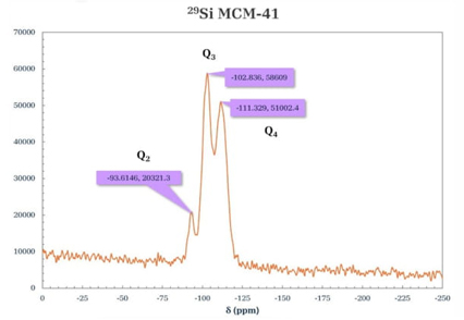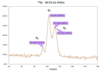 The spectra (Fig. 9 and 10) were obtained using the high-power decoupled direct-polarization (HPDEC) technique. The spectrum of 29Si for MCM-41 (Fig. 9) showed three signals that are associated with [Qn = Si(OSi)n(OH)4-n by convention] Q2 corresponding to geminal groups, Q3 to free and neighboring single silanols, and Q4 type signals corresponding to siloxane groups. Two intense signals were observed in the spectrum at δ = -102.836 and -111.329 ppm assigned to species types Q3 and Q4, respectively. In addition, a lower intensity signal at δ = -93.6146 ppm, associated with Q2 species, corresponds to the MCM-41 materials described in the literature [31]. The spectrum 29Si-RMN of the porous material functionalized with PSSA (Fig. 10) shows signals at δ = -103.407 and -111.899 ppm, which are attributed to the silicon groups in the silica matrix with chemical environments of Q4 [Si(SiO4)] and Q3 [Si(SiO3)OH], respectively. This was not observed in the parent MCM-41, which was attributed to the modification of the material with the added PSSA and modifying the Q4 environment of the silicon atom bonding [32].