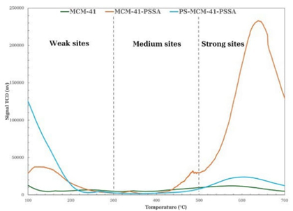 To study the distribution of acid sites on the surface of MCM-41, MCM-41-PSSA, and PS-MCM-41-PSSA, NH3-TPD analysis was performed, from which ammonia desorption profiles were obtained (Fig. 11). As can be seen, it is evident that by incorporating PSSA on MCM-41 (MCM-41-PSSA), the amount of solid acid sites increases; this is due to the presence of sulfonic groups (-SO3H) that give acidity to the porous material. In contrast, the PS-MCM-41-PSSA material presented a decrease in its weak, medium, and strong acid sites compared to MCM-41. For the classification of acid sites, weak acid sites were defined as those located at temperatures below 300 °C, while intermediate acid sites were identified as those found between 300 °C and 500 °C, and strong acid sites as those situated at temperatures above 500 °C [33]. Table 3 lists the total acidity of each material.