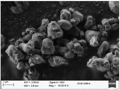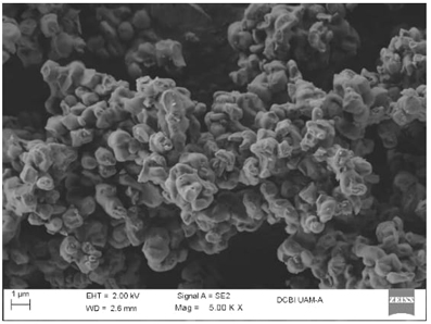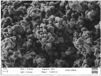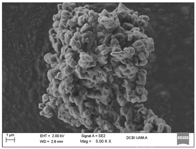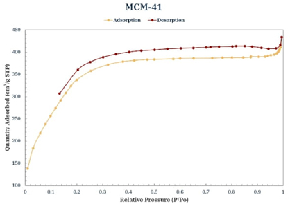 Ultrasound-assisted synthesis of MCM-41. In a 250 mL Teflon vessel, 0.3 g of cetyltrimethylammonium bromide (CTABr, Aldrich) was dissolved in a solution of 16 g of ammonium hydroxide (NH4OH, Aldrich 35 wt. %) and 63 g of deionized water; the mixture was kept under stirring until a homogeneous solution was obtained. Then 1.36 g tetraethyl orthosilicate 98 wt.% (TEOS, Aldrich) was added dropwise under vigorous stirring. The resulting solution was sonicated using a Bransonic model 5210E-DTH ultrasound generator with a frequency of 47 kHz and a power of 140 W at 30 °C for 2 h. The molar composition of the mixture was determined using a Bransonic model 5210E-DTH ultrasound generator with a frequency of 47 kHz and a power of 140 W at 30 °C for two hours. The molar composition of the reaction mixture was 1 TEOS: 0.125 CTABr: 69 NH4OH: 525 H2O. The resulting precipitate was filtered under vacuum, washed with deionized water, dried at room temperature, and calcined at 600 °C at a heating rate of 2 °C/min for 6 h in an inert (nitrogen) atmosphere [18]. The white solid obtained was labeled MCM-41.
