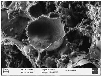 To obtain the PS-modified material, the same procedure as describe in the previous point was followed, but before adding TEOS, 0.025 g of expanded PS (average sphere size of 4 mm) without last treatment and obtained from the protection plate of a household appliance) was added to the solution of CTABr, NH4OH, and deionized water. Ultrasonic treatment, drying, and calcination were performed in the same way as described above. The white solid obtained was labeled PS-MCM-41.