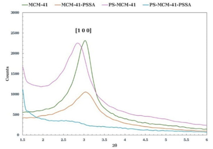 According to the comparative of X-ray diffraction patterns in Fig. 2, the presence of the characteristic peak of MCM-41, located between 2.7 and 3.1° 2θ and associated with the reflection of the (100) plane of a hexagonal structure, can be observed [20,21]. By adding PS to the synthesis of MCM-41, the peak intensity presented by PS-MCM-41 decreased slightly and shifted to the left; however, the MCM-41 structure was maintained. Notably, the intensity of the diffraction peak of MCM-41-PSSA abruptly reduced concerning MCM-41 because of the incorporation of PSSA inside its pores, which decreased the short-range ordering identified in the diffraction pattern [22]. With the functionalization of PS-MCM-41 with the PSSA group, the intensity of the diffraction peak (ordering) was almost completely lost; however, the porosity was not lost, and the specific area was preserved, as observed in the BET and SEM results. A summary of the interplanar distances with the respective angles of 2θ is shown in Table 1.