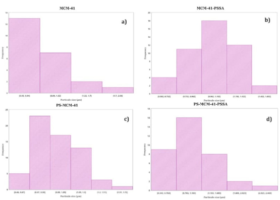 Fig. 20 Particle size histograms of (a) MCM-41, (b) MCM-41-PSSA, (c) PS-MCM-41 y (d) PS-MCM-41-PSSA.